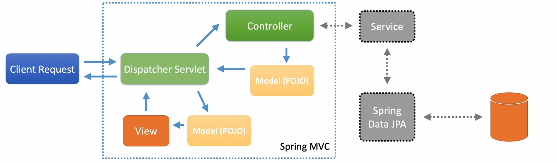 Imagine a typical Spring MVC structure with a controller, service layer, and repository: